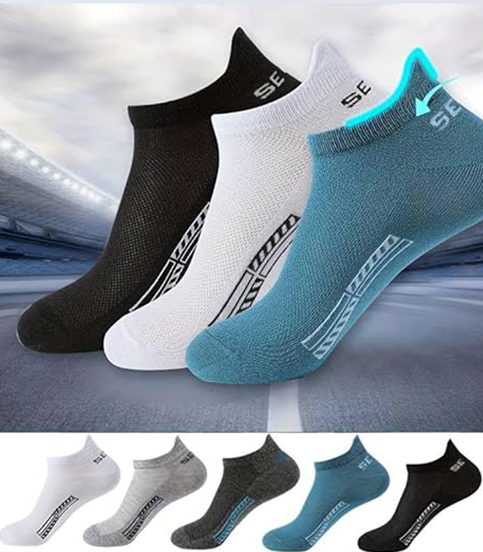 OverviewCOMFORT BEYOND COMPARE: Elevate your gym sessions with our Men's Trainer Gym Mesh Ankle Socks, where comfort takes center stage. Crafted with precision and designed for performance, these socks are your ultimate workout companion. SLEEK STYLE, FIVE WAYS: Experience versatility like never before with our Trainer Gym Socks, available in a sleek pack of 5. Unleash your style with the choice of five captivating colors: Black, Grey, Dark Grey, Blue, and White. Mix and match to suit your mood and outfit, or stick to your favorite shade for that signature look. UNMATCHED BREATHABILITY: The gym can get intense, and so do your workouts. Our socks feature a unique mesh design that offers unparalleled breathability. Say goodbye to sweaty feet and hello to an experience that keeps you cool and dry throughout your training sessions. PREMIUM MATERIALS FOR PERFORMANCE: These socks are meticulously crafted from a blend of premium materials. With 78% Cotton, 20% Polyester, and 2% Elastane, they strike the perfect balance between comfort, durability, and flexibility. Whether you're lifting weights or hitting the treadmill, these socks are designed to keep up with your active lifestyle. ONE SIZE FITS ALL: Simplify your shopping experience with our one-size-fits-all design. No need to worry about finding the right size; these socks are designed to accommodate a wide range of foot sizes comfortably.